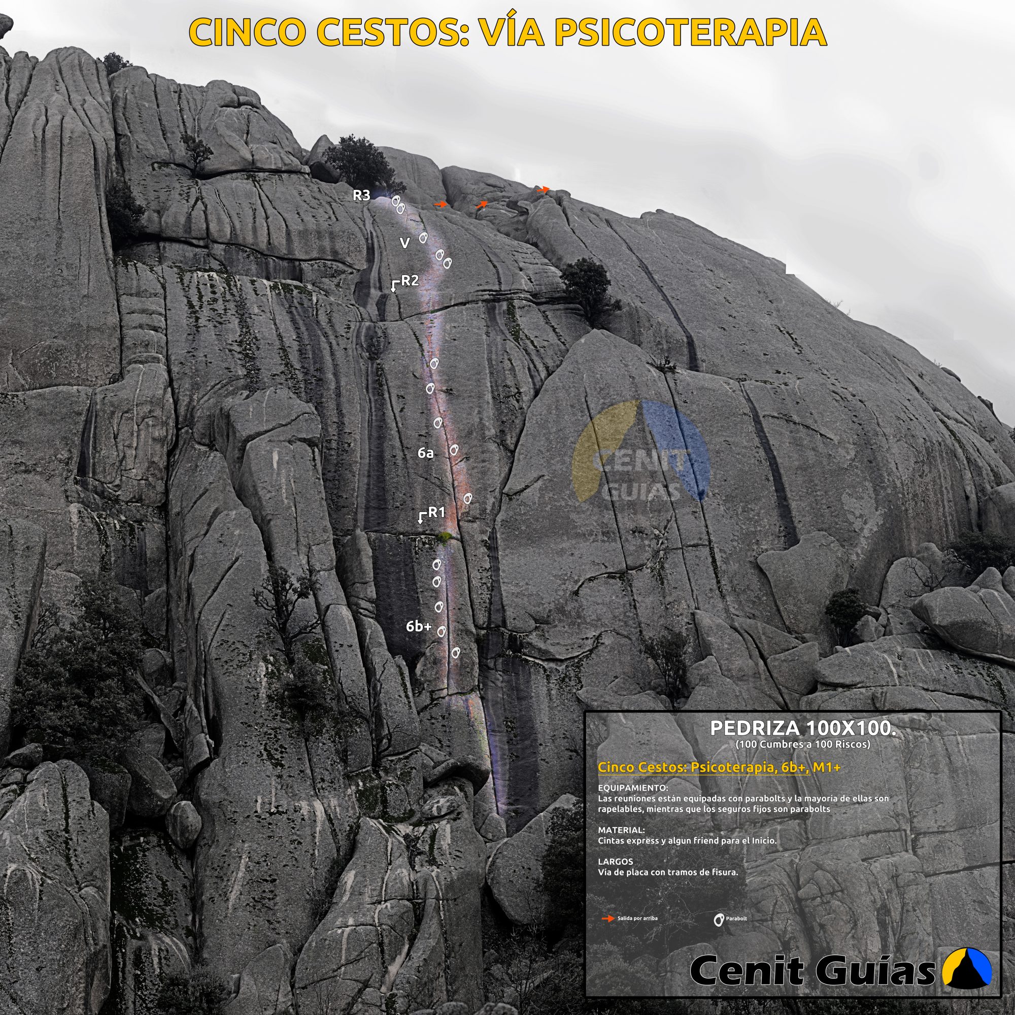 L1 6b+: Iniciamos en una fisura muy tumbada, que podremos proteger con algún friend, nos lleva a el paso más duro de la vía; montarnos en la fisura ciega, esta la deberemos proteger con algún friend, pues a la primera chapa no llegaremos sin montarnos en ella. continuaremos para la fisura que se irá cerrando para acabar llegando a la reunión con unos últimos pasos de placa.