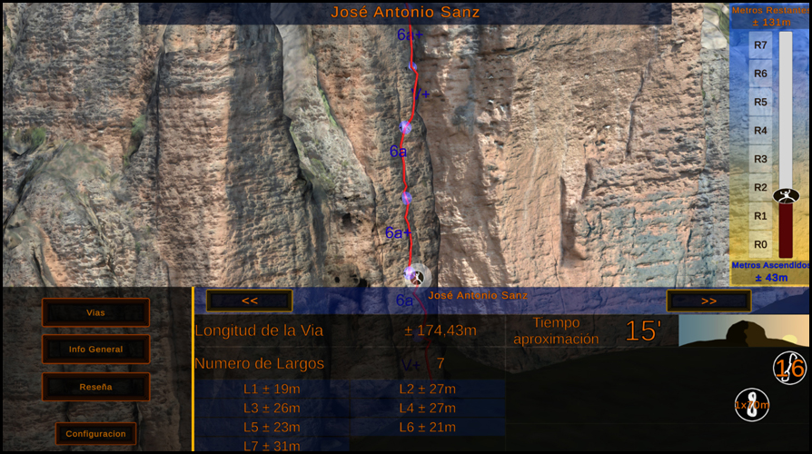 Guía de escalada, con las vías señaladas sobre modelo 3D de los Mallos de Riglos.